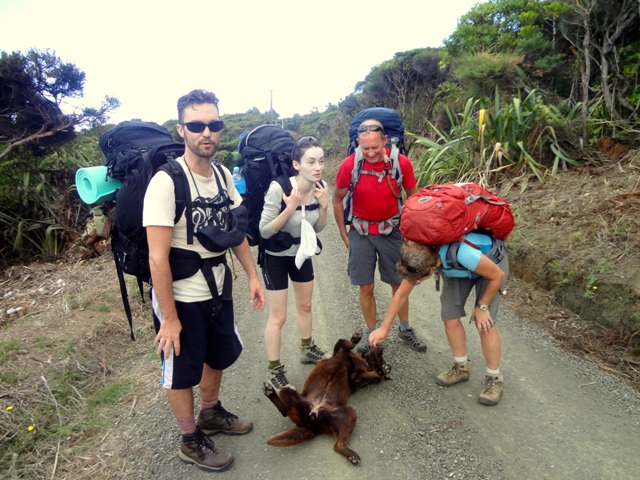 Today (31 March) I was up on Log Race Road at midday on quite another task, and met, in quick succession, three groups on Day Three of the Hillary Trail. They stopped to say hello to the neighbour’s dog, who was very welcoming.